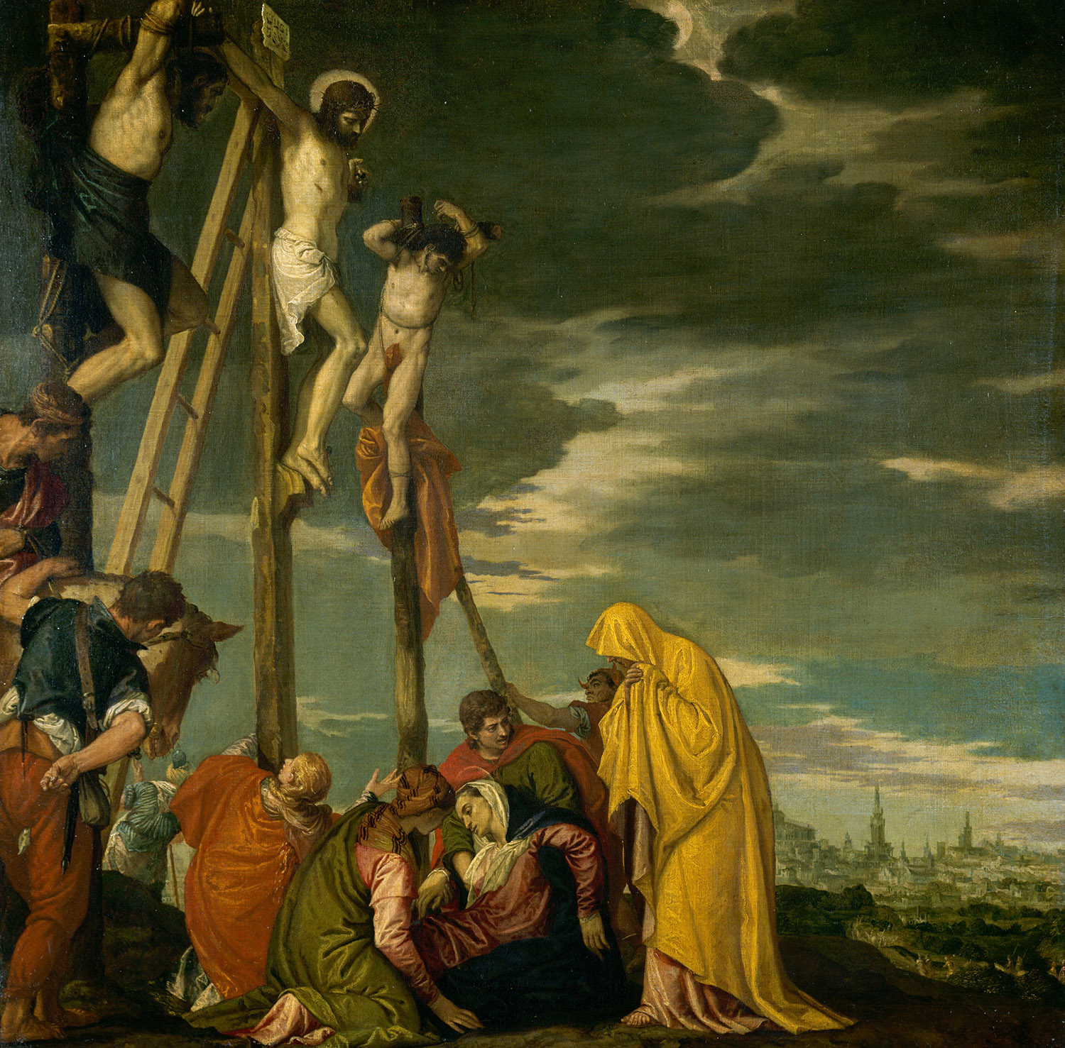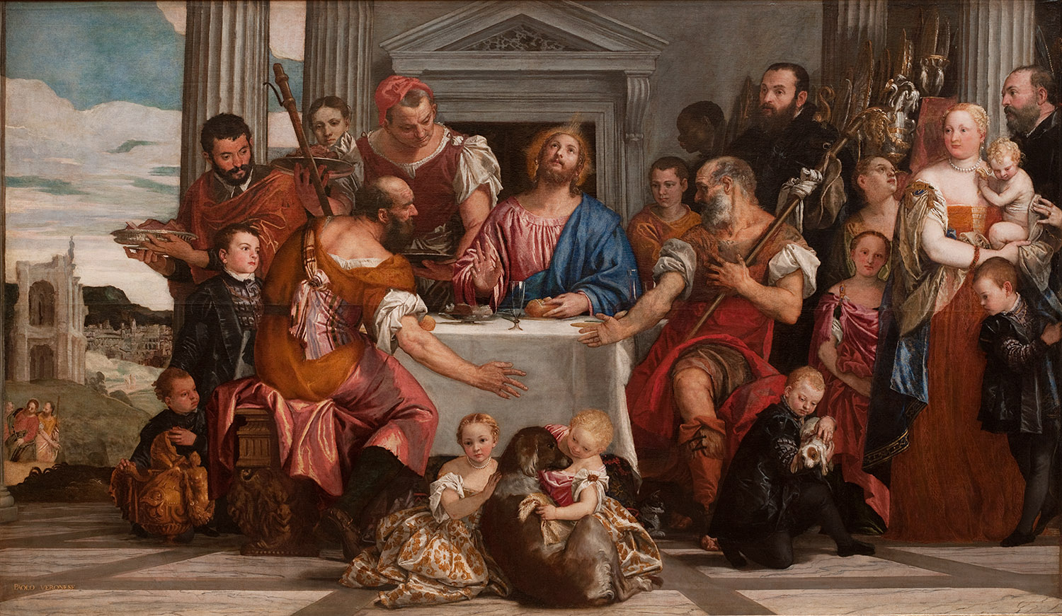 Veronese painted the scene for the refectory of the monastery on the island of San Giorgio Maggiore in Venice. In 1798, Napoleon’s troops confiscated the painting and had it shipped to Paris. When the Empire fell in 1815, most of the confiscated paintings were returned to Italy, but it was feared that the return journey would damage this large work, which was therefore kept in exchange for a painting by Charles Le Brun, The Feast in the House of Simon. Nonetheless, Veronese’s huge masterpiece had to be moved twice in later years, when Paris was at war, in 1870 and 1939.