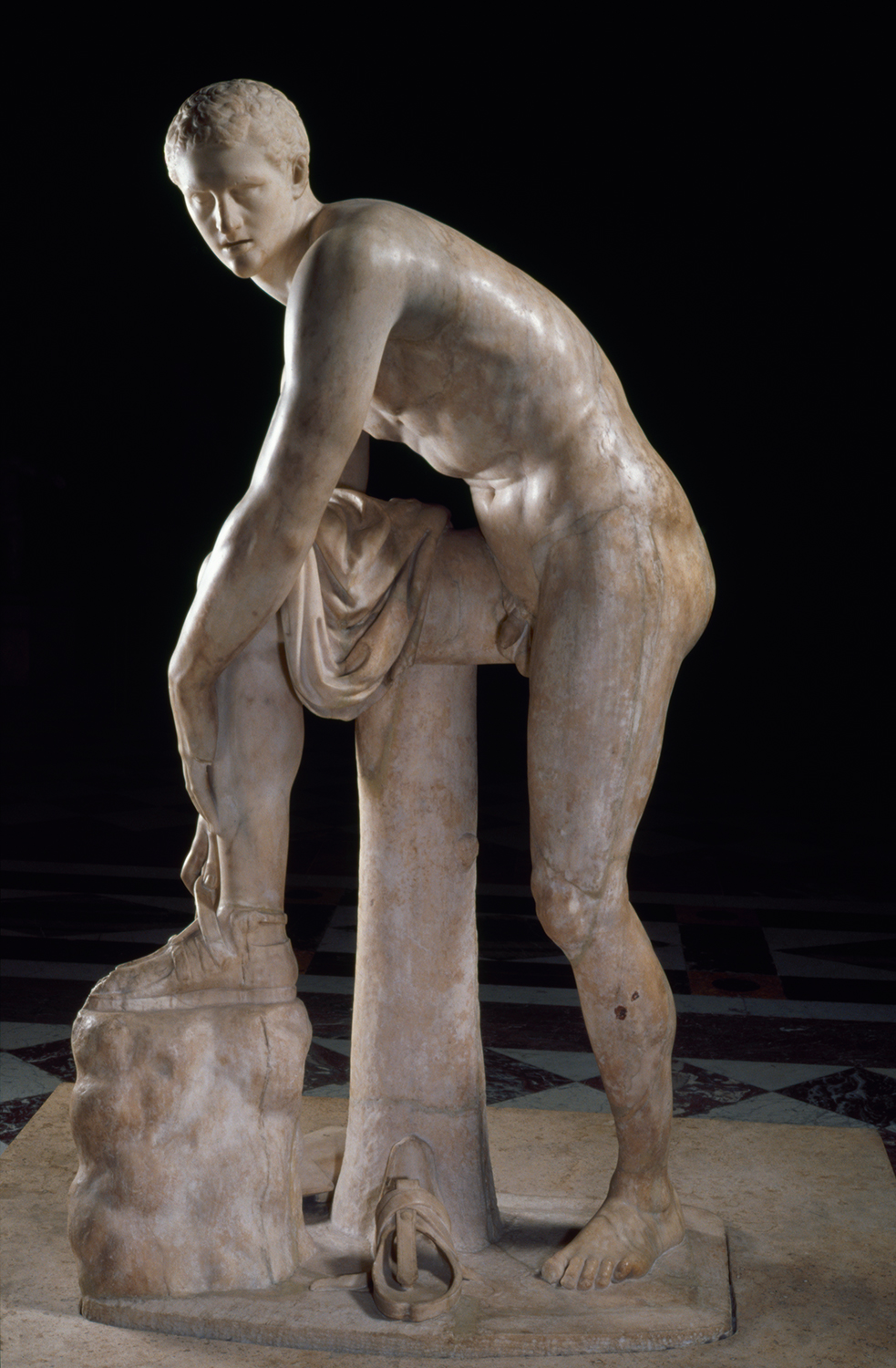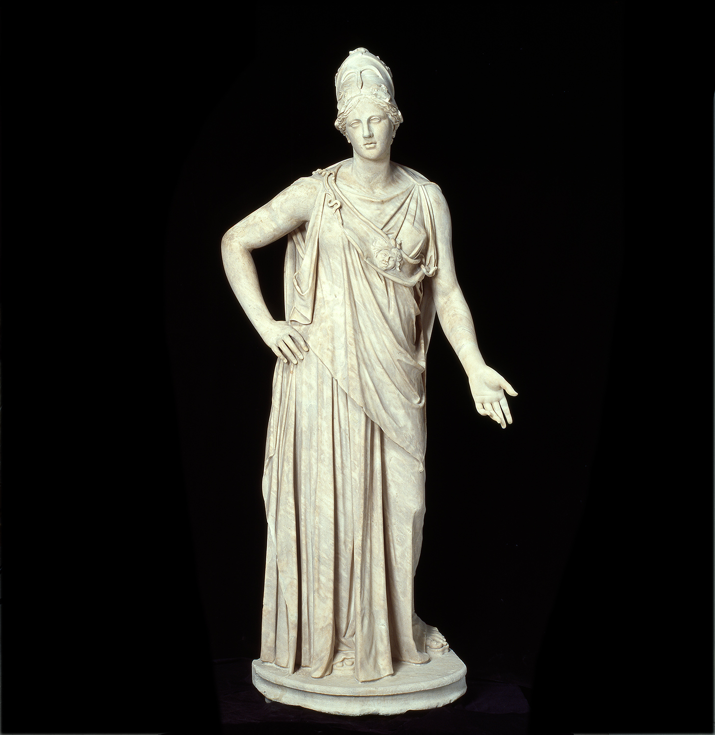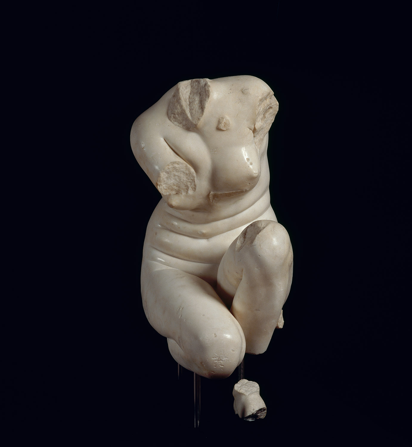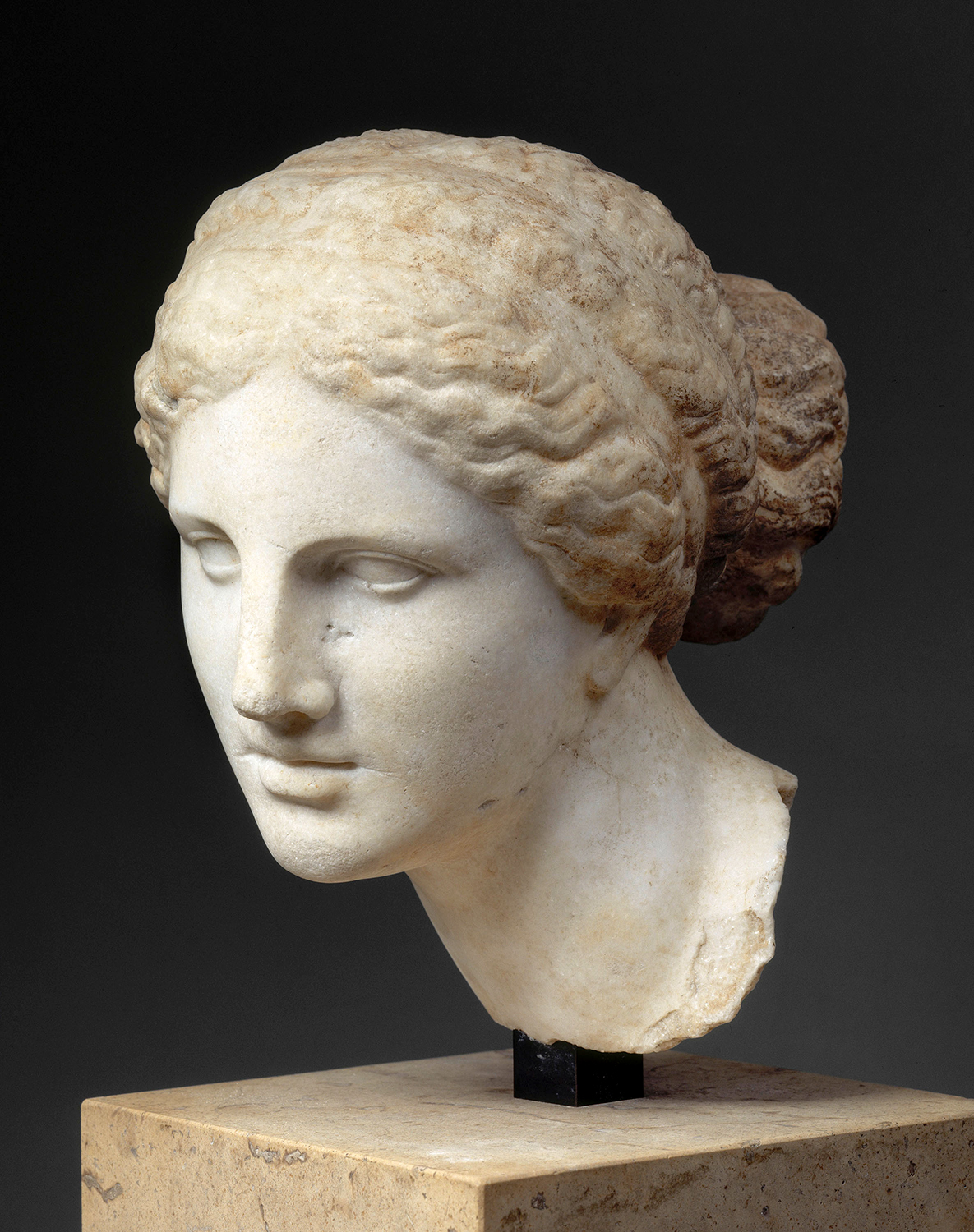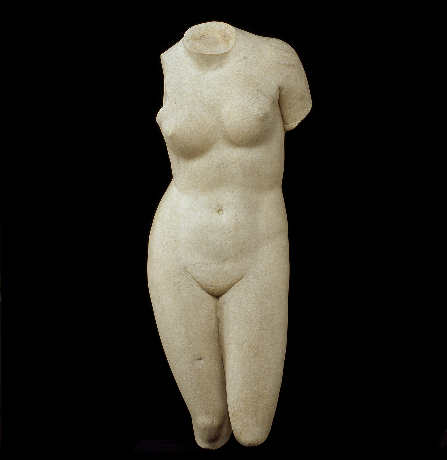 Like many classical statues, the Venus de Milo was carved from separate blocks of Parian marble. The body was sculpted in two parts; the join between the torso and legs is difficult to see, hidden in the drapery at the hips. We know from a mounting hole at the left shoulder that the arms were also carved separately then added to the torso. Other sculptures in the same room show how separately carved blocks were joined together later.