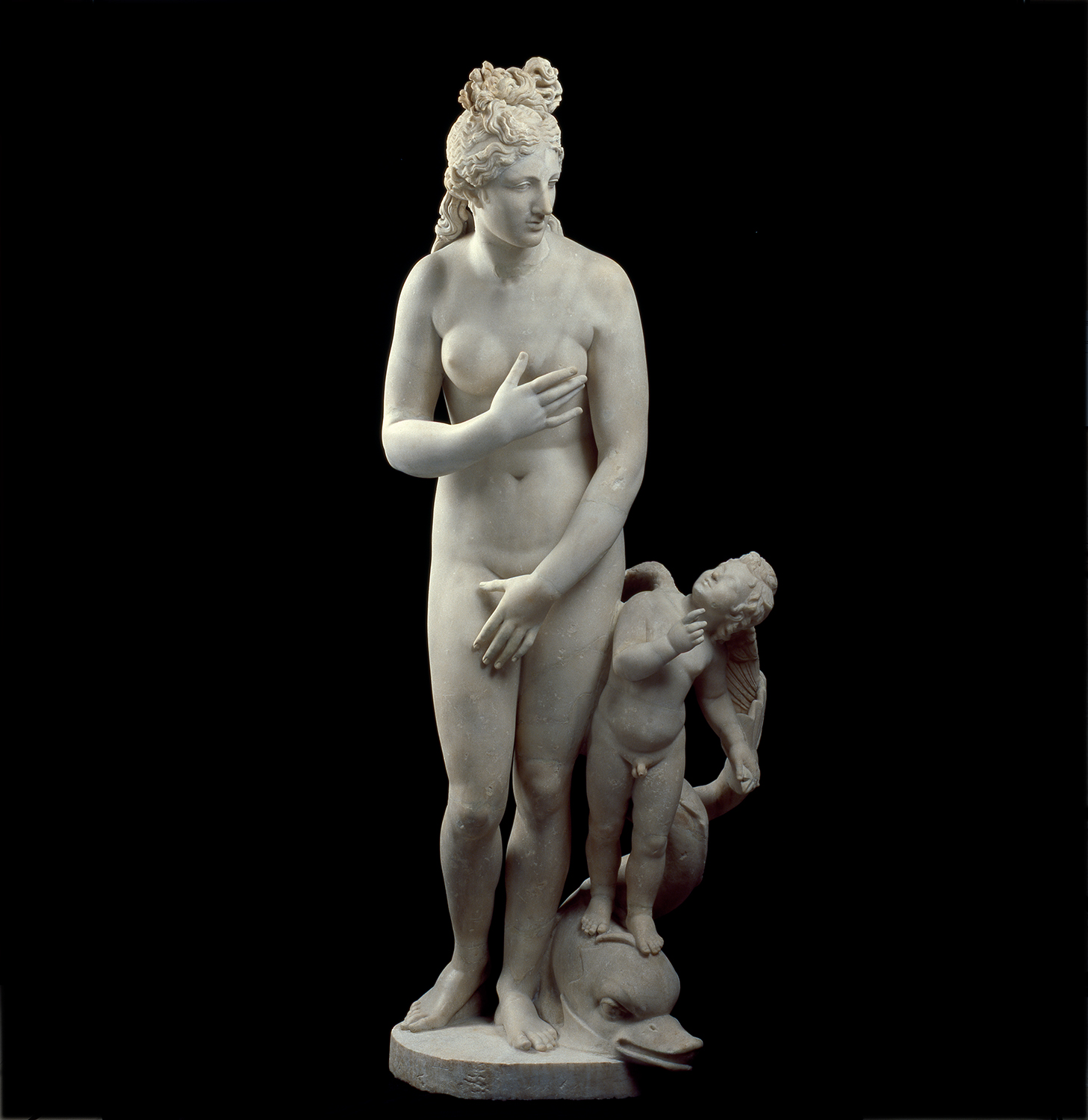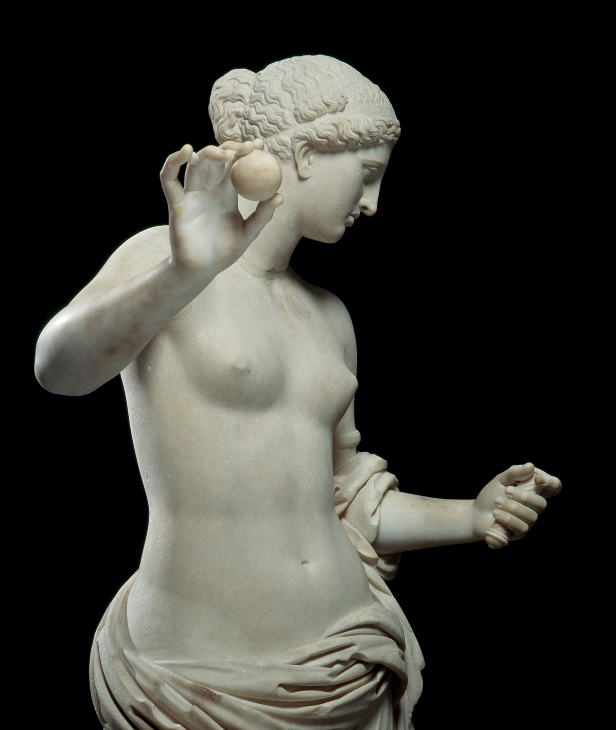 The Venus of Arles had embodied ideal classical beauty before the Venus de Milo arrived on the scene! She was also named after the place where she was found – in this case the Roman theatre of Arles in southern France, in 1651, during the reign of Louis XIV. Again, there was debate as to whether she was Venus or another goddess, but the Sun King, greatly impressed by the ancient masterpiece, decided that she was a Venus. He had the statue restored by the sculptor François Girardon, who endowed her with her traditional attributes: the apple (awarded by Paris to the most beautiful goddess) and the mirror.