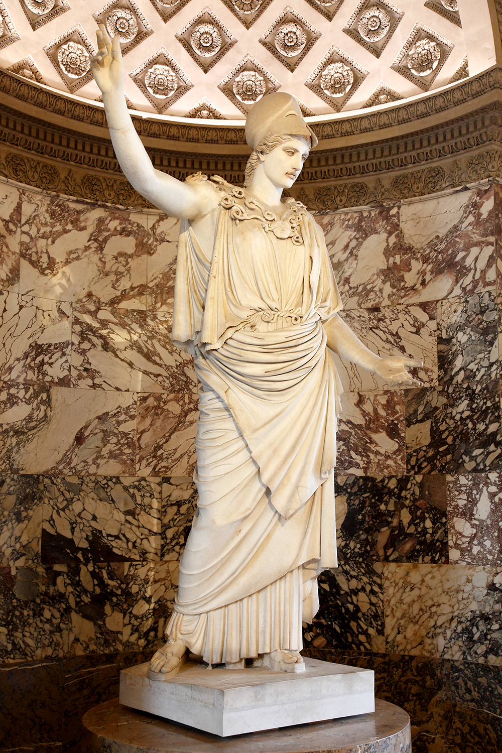 The Venus de Milo can be admired today in the last of a long series of rooms where she stands in almost solitary splendour. The magnificent red marble decoration dates from the early 19th century and the reign of Napoleon I.