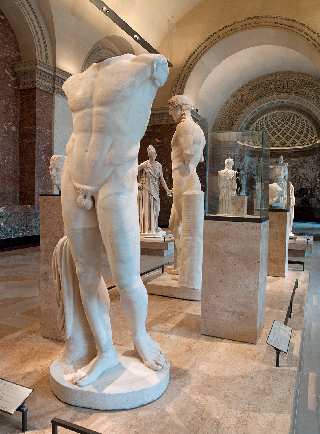Like the first part of the gallery, the new rooms replaced the royal apartments – but Percier and Fontaine changed their layout completely, demolishing partition walls to enlarge the space and adding grey and red marble to set off the whiteness of the statues. The inauguration took place in 1811, ten years before the arrival of the Venus de Milo.